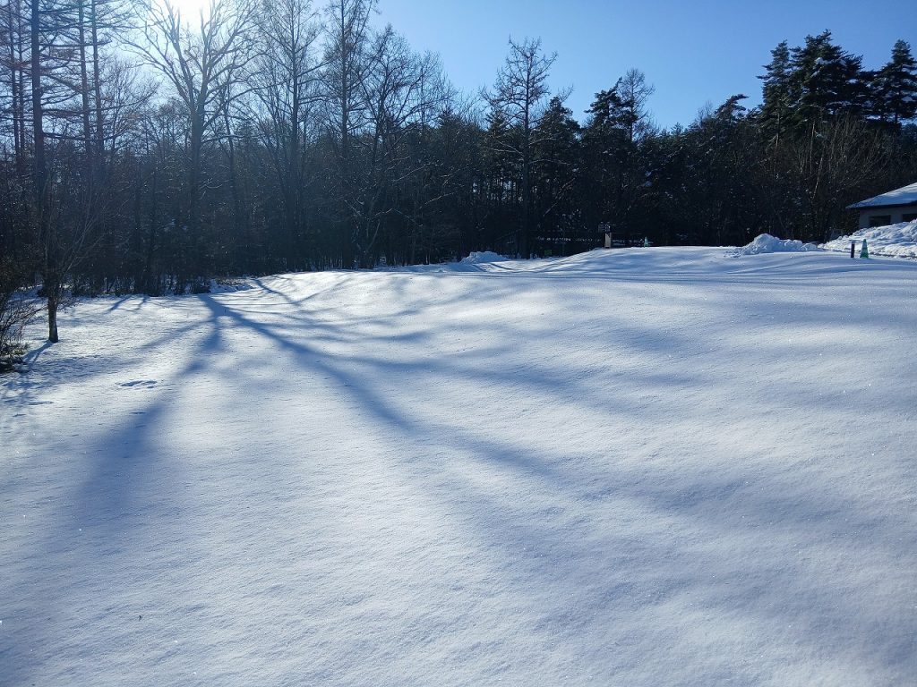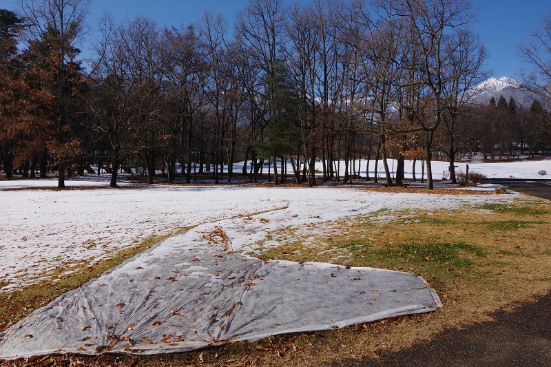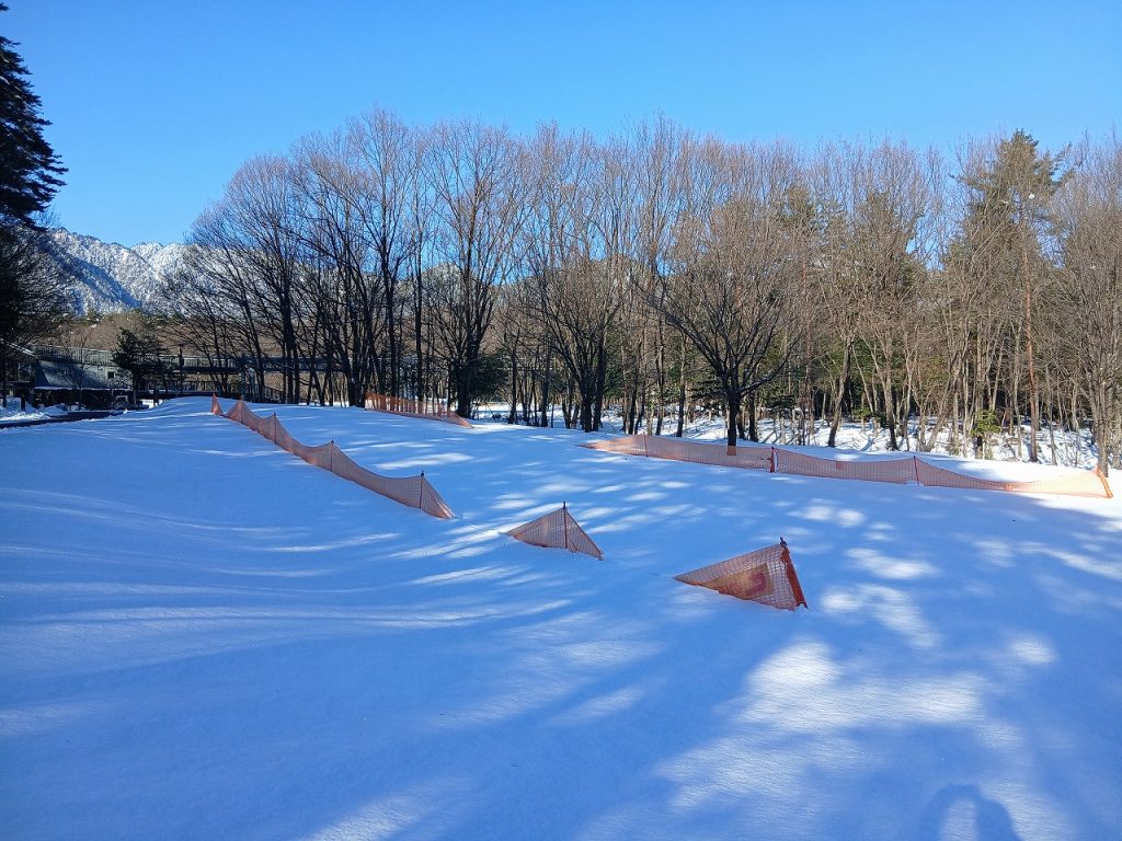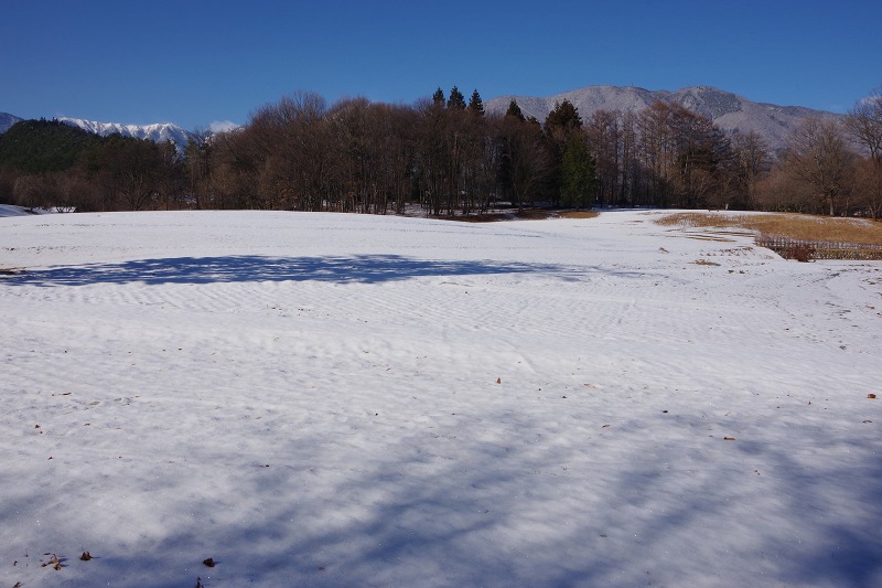 穂高口前の見晴らしの丘も雪景色。雪の下にはネモフィラが植えられています。冬の間に根を張って、来年の春に青い花を咲かせてくれますよ。