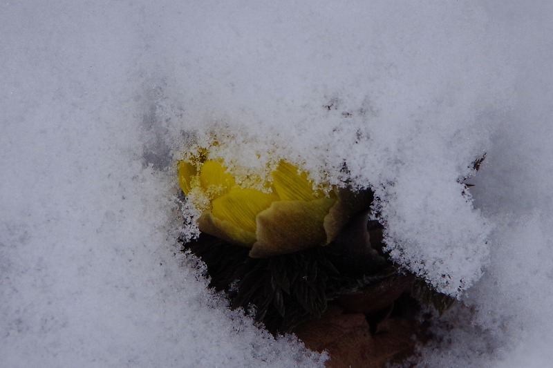 そして水辺の休憩所近くではフクジュソウが咲き始めました。今日は開きかけのつぼみに雪が積もっていましたよ。2月は何度も雪に覆われることがあります。
