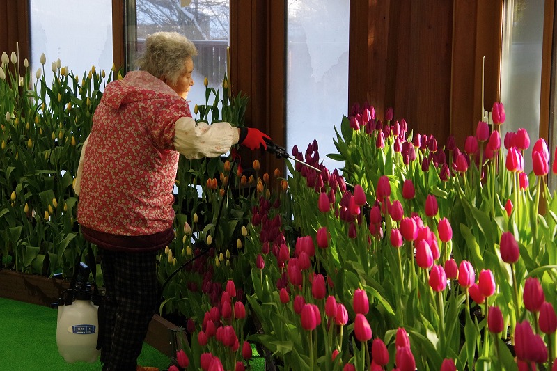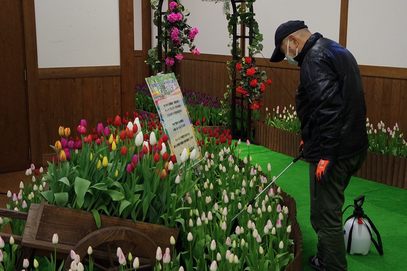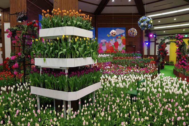 あづみの学校多目的ホールで開催中の『インドアガーデン アイスチューリップの庭』では、すべてのチューリップに色が付いて見頃になりました。