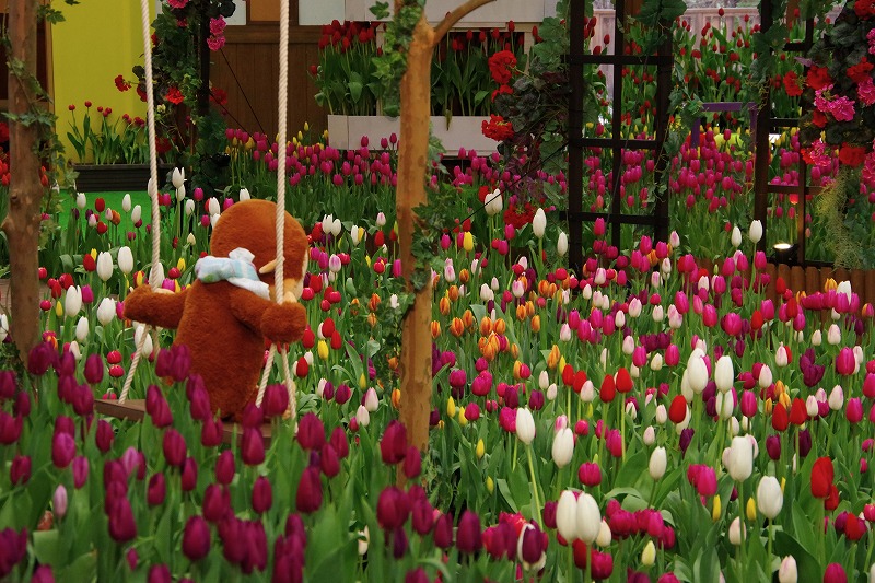 ブランコに乗った〝おさるのジョージ〟も嬉しそうです。少し下を向いていますが、きれいなチューリップをじっと見つめているようで可愛らしいですね。