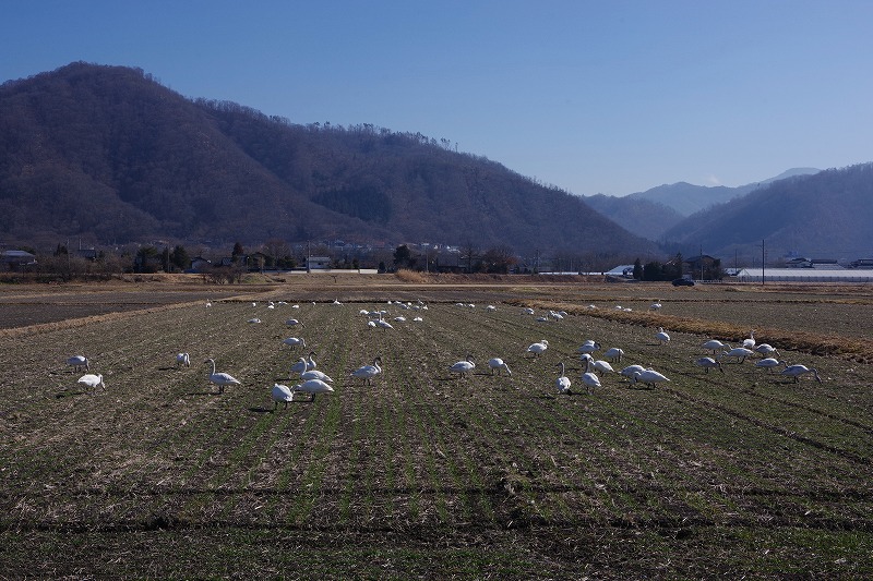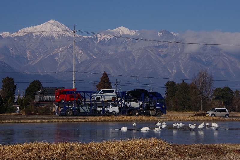 今朝になって反対側から見ると、この場所でも北アルプスを背景に休息する姿が観察できました。人の生活圏まで来てくれるコハクチョウに感謝です。