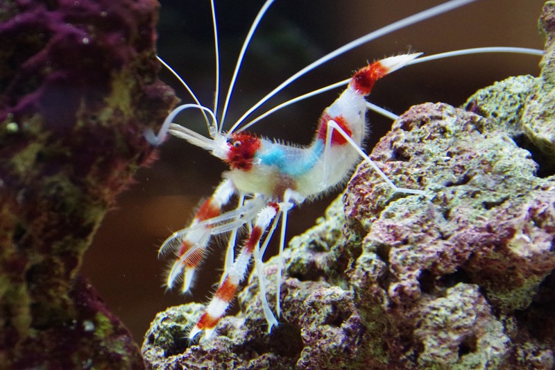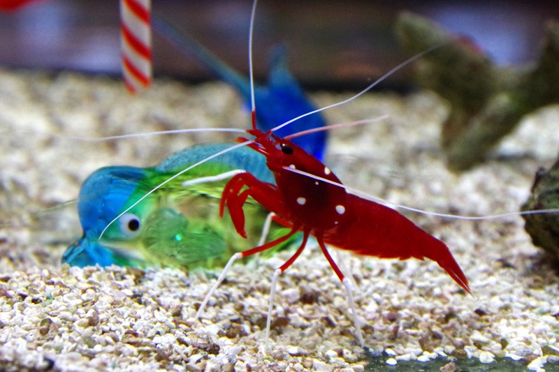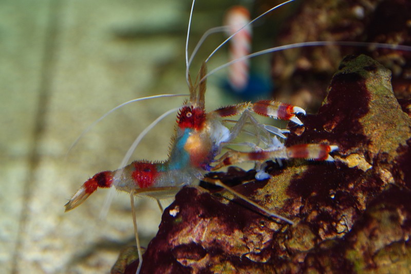 餌はバナメイエビの切り身を与えます。餌が少ないと他のエビの脱皮直後を襲ってしまうこともあります。時には狂暴ですが鮮やかな姿を見てくださいね。
