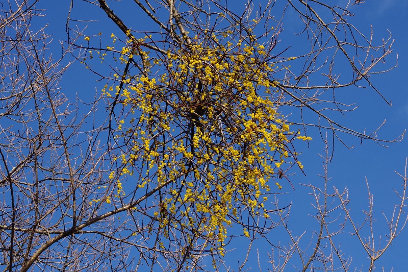 野原にある大きなエドヒガンの木。葉をすべて落とした枝の一部が黄色くなっていましたよ。近づいて見るとヤドリギの実が生っていました。