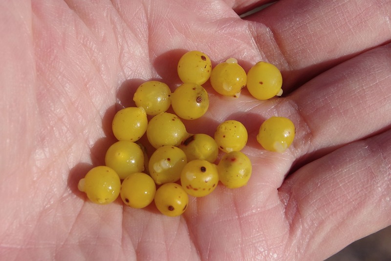 実を潰してみると、果肉には粘り気があるのがわかります。鳥が食べて糞を落とすことで、種が木の枝に付いて寄生しやすくなるのです。