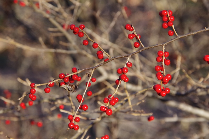 今の時期、公園で見られる丸い実のひとつがウメモドキ。冬でも赤い実が残るので庭木や生け花に好まれます。冬場の小鳥たちの貴重な餌にもなっています。