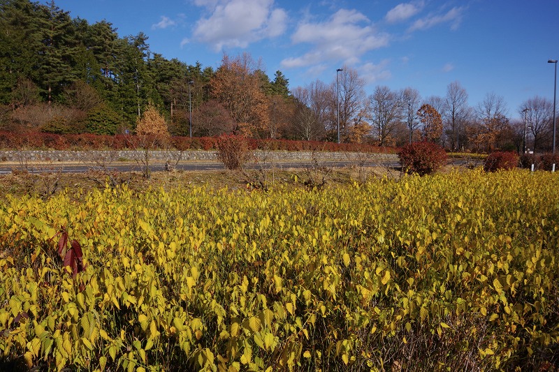第2駐車場の植え込みに並ぶのはシモツケです。他の木々の紅葉はすでに終わっていますが、霜や雪にも負けずに遅い紅葉を見せてくれています。