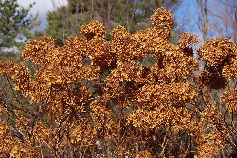 第1駐車場の植え込みでは、茶色くなったノリウツギの花序が残っていました。紅葉ではありませんが、ドライフラワーのようになっていて面白いですね。
