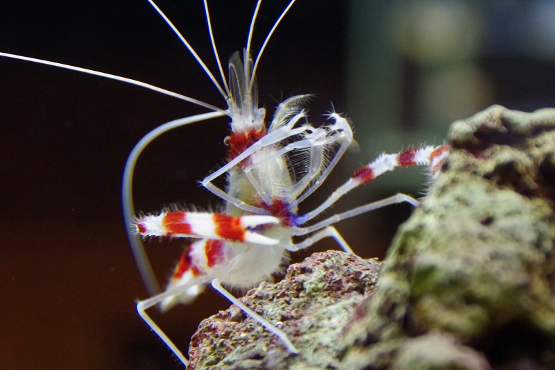 あづみの学校理科教室の特別展示『トロピカル クリスマス』の海水水槽。水槽の中で一際目を引くのがオトヒメエビです。長い触覚は、左右の端から端まで20㎝以上もあります。優雅な姿が乙姫蝦(乙姫海老)の名前の由来です。