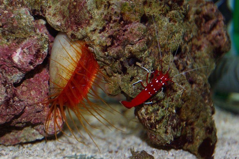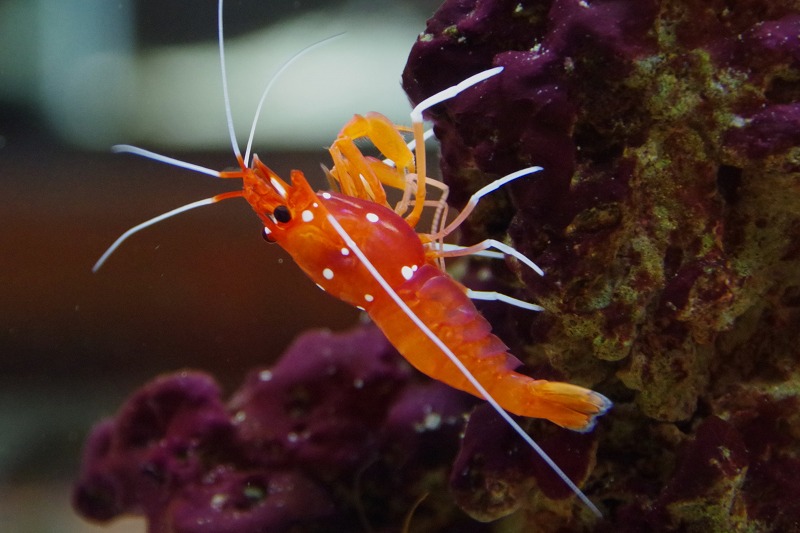 昨日紹介したオトヒメエビと同じ水槽に暮らしているのはシロボシアカモエビ。この水槽のメインです。赤と白の体色とホワイトソックスという英名から〝サンタエビ〟の愛称でも親しまれています。まさに水中のサンタクロースです。