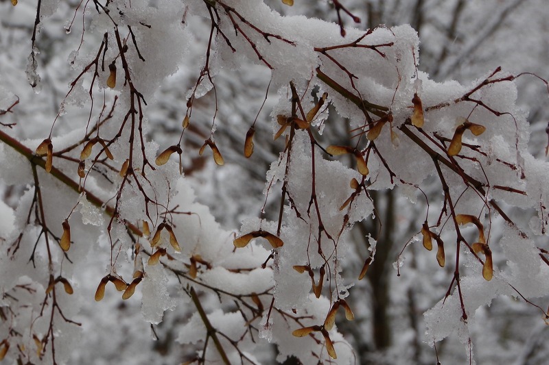 まだ枝に残っているイロハモミジの実。乾燥していると落ちる時にプロペラのようにクルクルと回ります。湿っていると上手く回らないかもしれませんね。