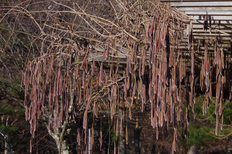 先ほどの休憩所の写真の左橋には藤棚があるのがわかります。棚の下にはフジの実がたくさんぶら下がっていました。パチッと音を立てて鞘が弾け、おはじきのような種が中から勢いよく飛び出します。瞬間を見てみたいですね。
