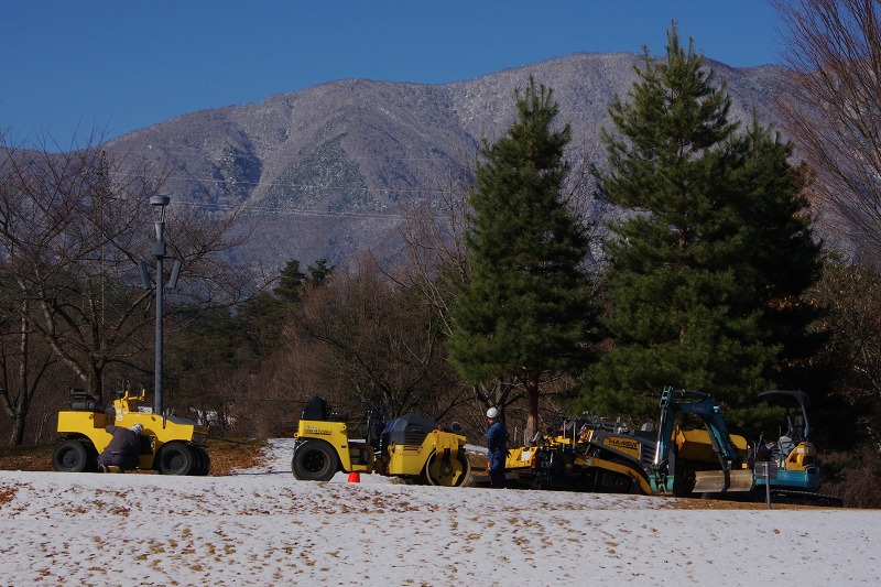 黄色い工事車両が並んでいるのは、野原にあるミニサッカー近くの園路。園路の一部が陥没していたので、開園前の時間に修復作業を行っていました。