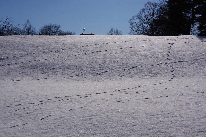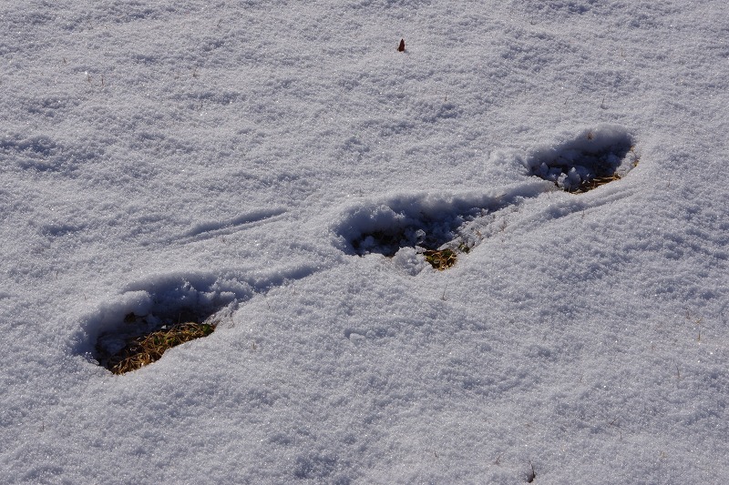 河畔の広場の斜面にはたくさんの動物の足跡が残っていました。雪が積もってから丸1日経っていたので、足跡周りが融けて一回り大きくなっていました。