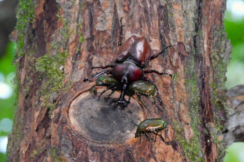 ノコギリクワガタやカナブンが集まっているのはヤナギの木。数日前から現れ始めました。樹液が出る良い場所を巡って、小競り合いが繰り広げられています。
