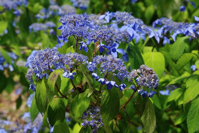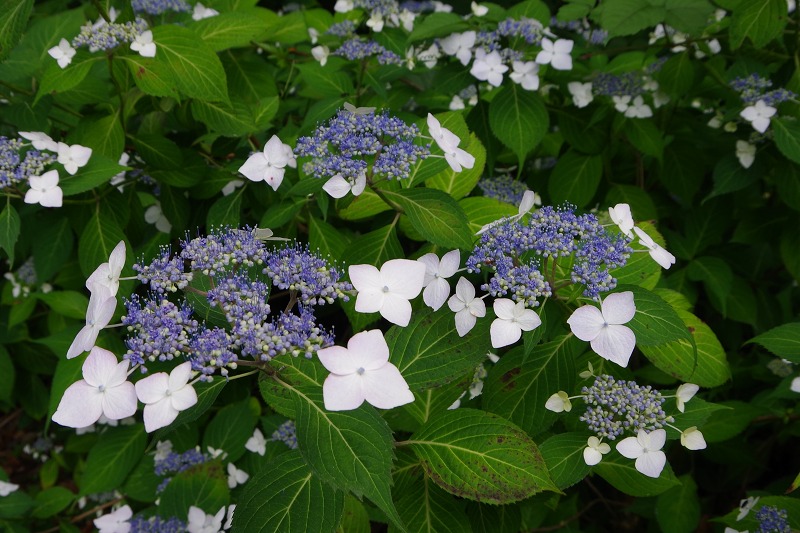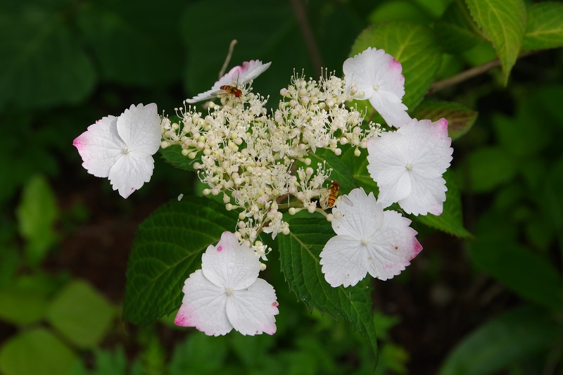 少し遅れて開花したのはガクアジサイでしょうか。最初に咲いたヤマアジサイよりも花序や葉が大きいのが特徴です。装飾花(萼)も白っぽい色をしています。