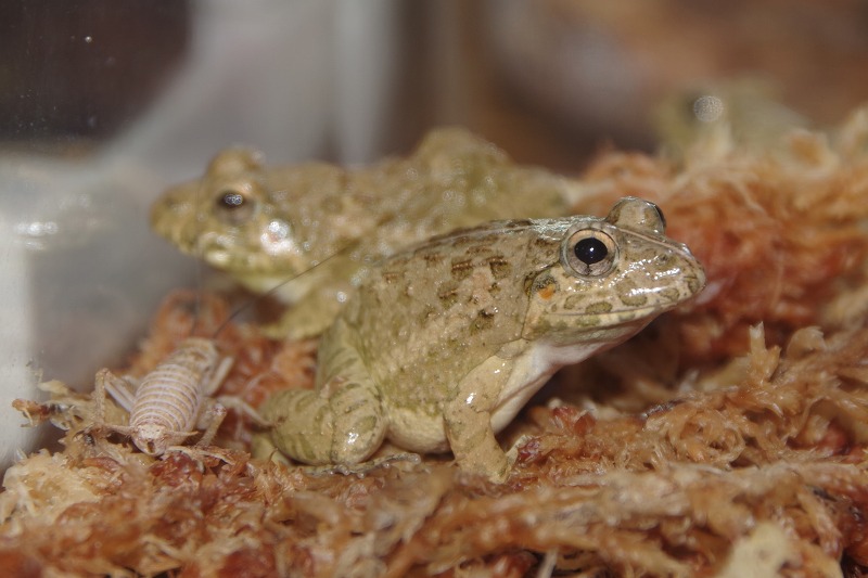 水生ガエルのマルメタピオカガエル。脱皮した透明の皮膚が、足の方に浮いているのがわかりますね。最終日まで、まだまだ楽しい発見がありそうですよ。