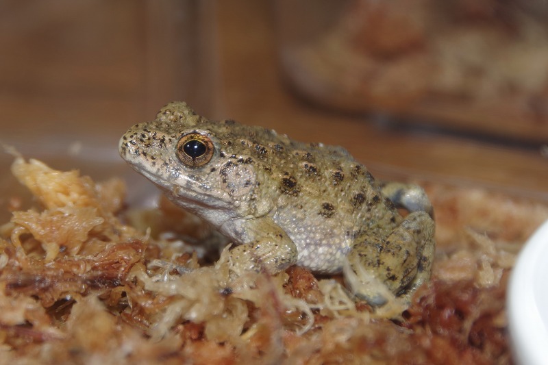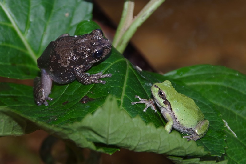 そんなアマガエルの中に黒いカエルが1匹。2022年5月に寄贈していただいた色彩変異個体です。最初は背中に金箔のような色も入っていましたが、今ではすっかり色褪せました。それでも今年で丸3年になりますよ。