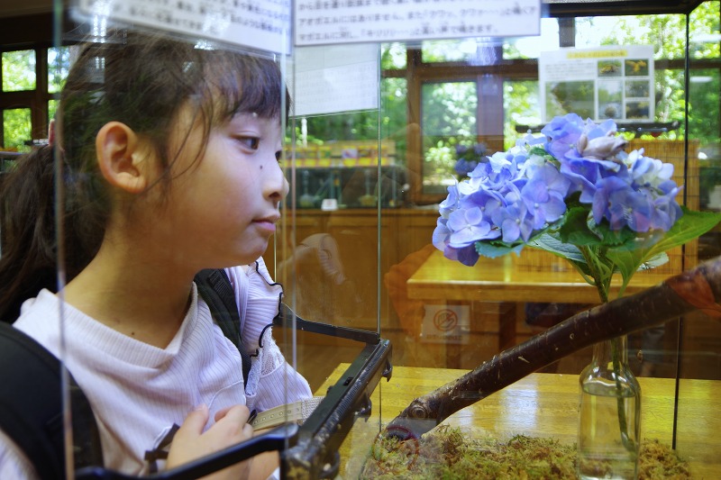 アジサイが飾られているアマガエルの飼育ケースでは、お花の上に乗っている可愛いカエルたちに癒されます。すっかりカエラーのお顔に戻りましたね。