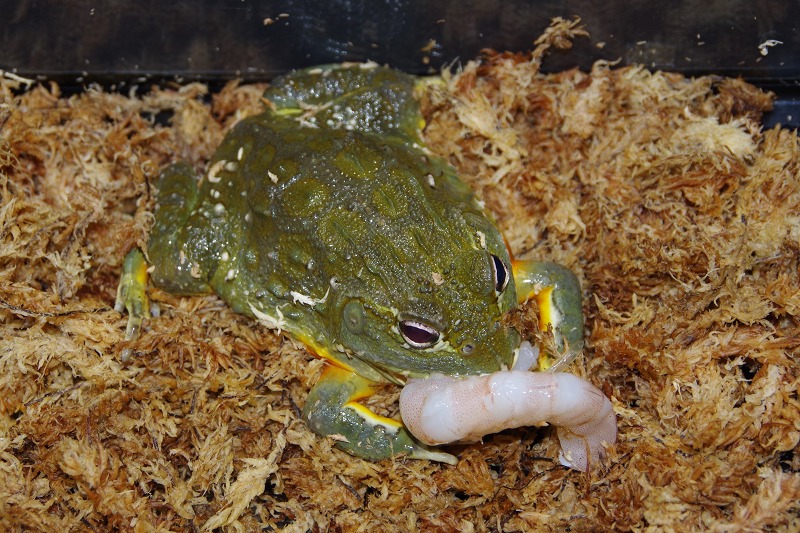 特別展示『あめあめ ふれふれ カエル展』は、今日で終了です。アフリカウシガエルの餌をあげているのは、昨日も来てくれた〝ちーたん〟です。