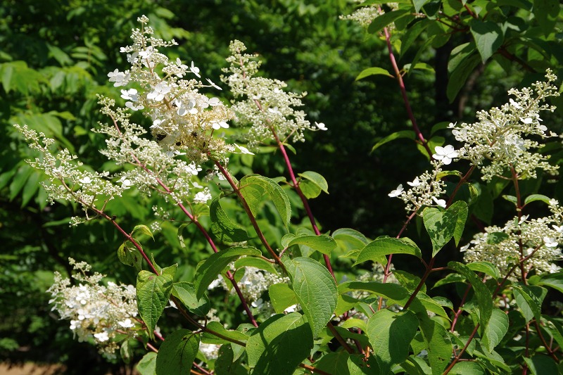 ノリウツギは咲き始めです。アジサイの花が盛り上がったような円錐花序が特徴です。特にコアオハナムグリがたくさん集まるようですね。