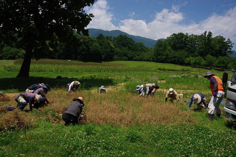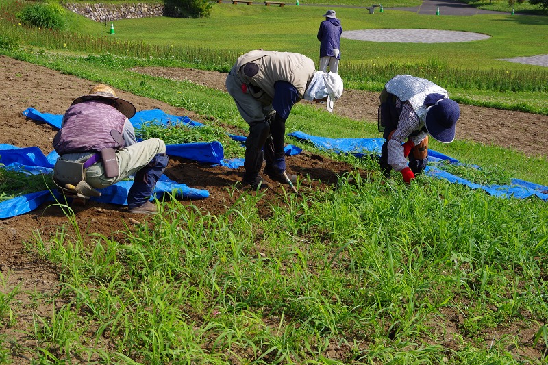 朝早くの時間でも強い日差しが照り付けます。時間が掛かる雑草の抜き取りは重労働です。〝シルバーズ〟の皆さんも、こまめに休憩を取りながらの作業です。