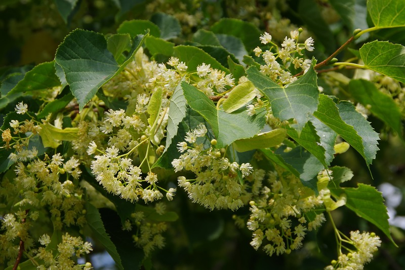 シナノキの花も見頃です。こちらも強い香りにシロテンハナムグリやハチたちが集まっています。野原や河畔の広場東側に大きな木がありますよ。