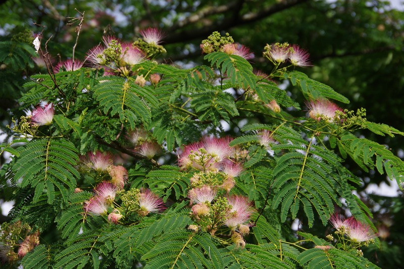 ネムノキの花も咲き始めました。花弁は無く、先端がピンク色の雄しべが集まっています。ブラシのような形が可愛らしいですね。夕方に咲き始め、翌日のお昼頃までには萎れます。夕方や朝早くが綺麗に見ることが出来ますよ。