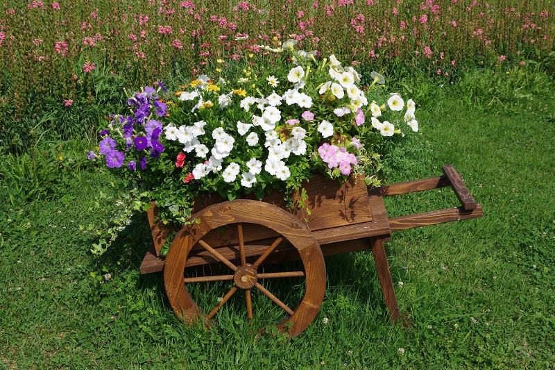 キンギョソウが終わっても花車のお花は元気いっぱいでした。別の場所でも使えそうですね。中でもペチュニアは春から秋まで長い期間花を咲かせますよ。