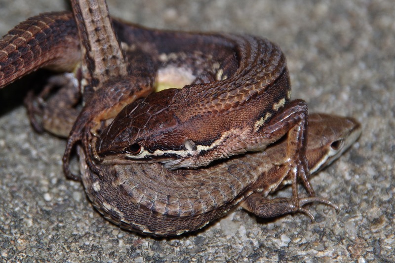 これはカナヘビが交尾中なのです。オスはメスの胴体に噛みついて離しません。全く動かない状態がしばらく続いたあと、いきなりメスが走り出しました。