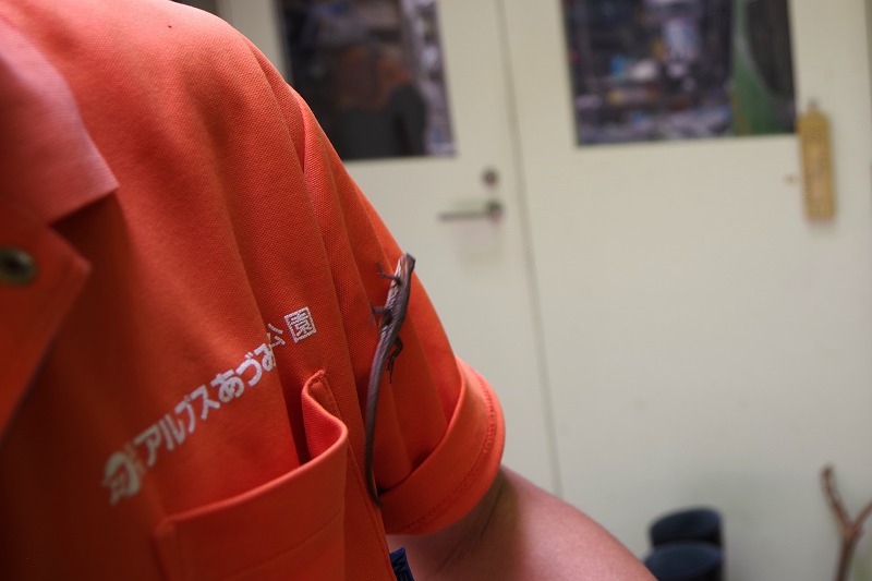 しゃがんで撮影していたのですが、靴に飛び乗ってズボンを駆け上がり、どこかへ隠れてしまいました。鏡で見ると背中の手の届かない所にしがみついていましたよ。その後腕の方にまわって来たので、撮影して逃がしてあげました。