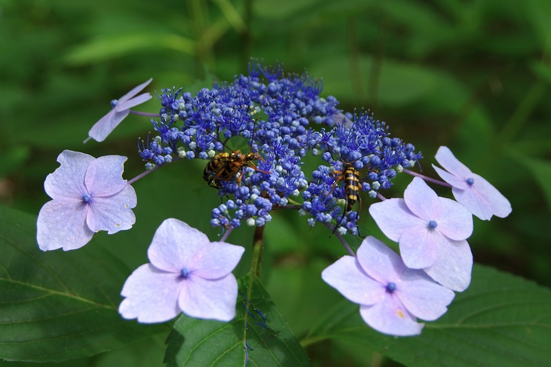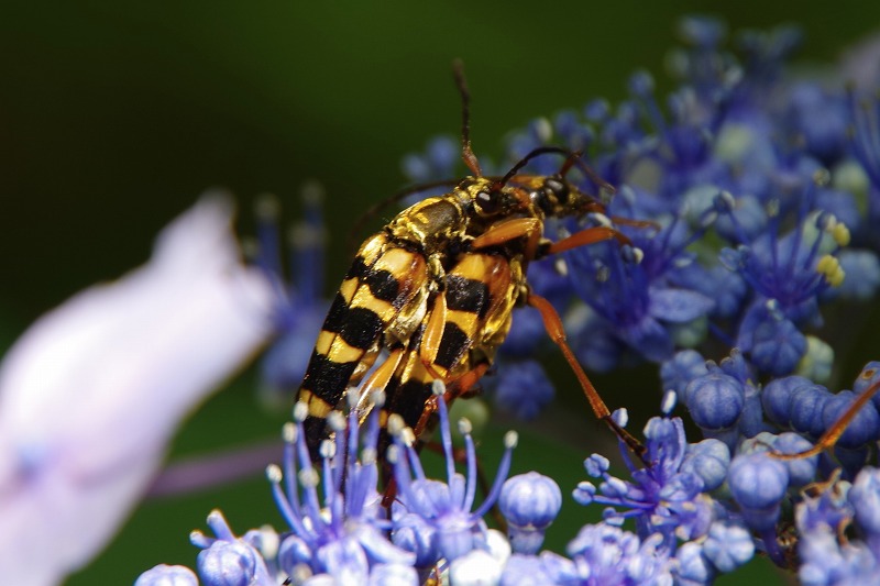 ヨツスジハナカミキリは、アジサイが見頃になると姿を現します。ノリウツギやリョウブにも集まりますが、アジサイの上にいる姿が一番画になりますね。