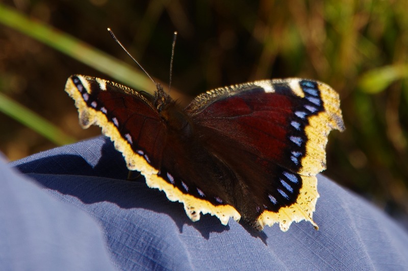 ヒマワリの撮影していたら、ズボンにキベリタテハがとまりました。樹液や動物の糞に集まるそうです。汗をかいていたので寄って来たのかもしれませんね。