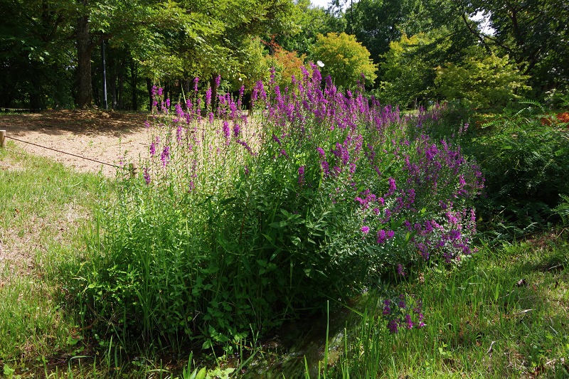 コリウスの花壇の北側。野原との間にある小川沿いでミソハギが咲いています。段々花畑に咲くミソハギよりも大きく成長しているようです。
