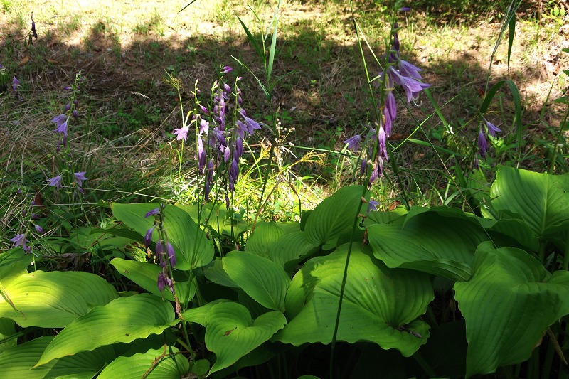 同じ小川沿いにはコバギボウシも咲いています。葉っぱはオオバギボウシのもの。オオバギボウシの間から出ているので紛らわしいですね。