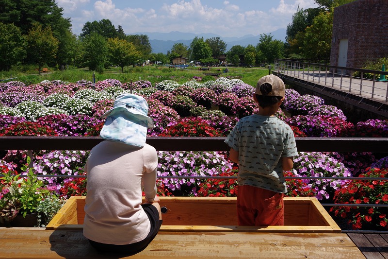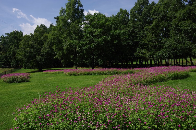 穂高口南側花壇ではセンニチコウ(千日紅)が見頃になっています。初夏には青いネモフィラが花壇を彩っていましたが、夏はピンクのワレモコウが主役です。