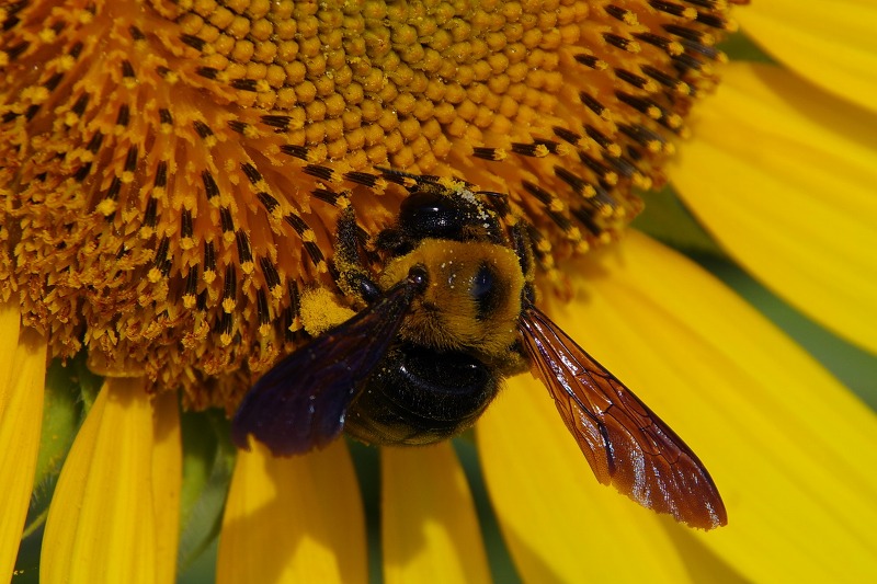 里山文化ゾーン・棚田エリアのヒマワリに集まる虫たち。多く見られるのがクマバチとタイワンタケクマバチです。胸の部分が黄色いのがクマバチですよ。