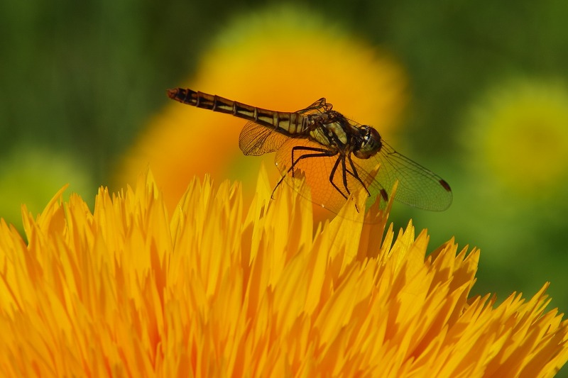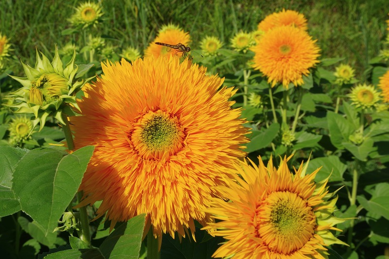 〝札幌八重まるこ〟にとまっているのは、まだ未成熟のアキアカネのようです。特等席でヒマワリ鑑賞。モコモコヒマワリを独り占めです。
