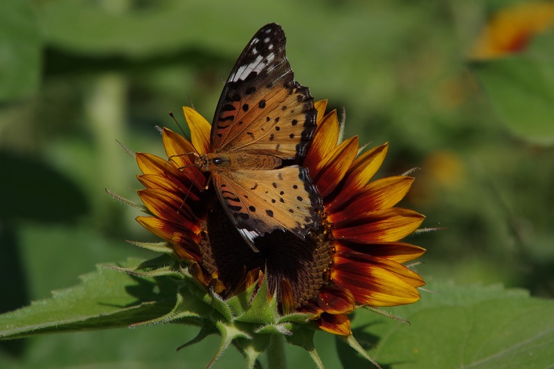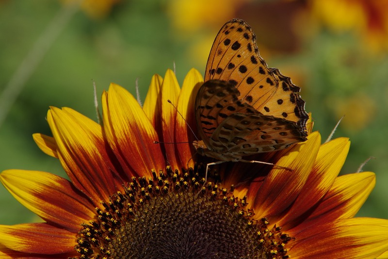 〝レッドリングバイカラー〟にやって来たのは、メスのツマグロヒョウモン。ヒマワリと同じような渋い色合いをしていますね。
