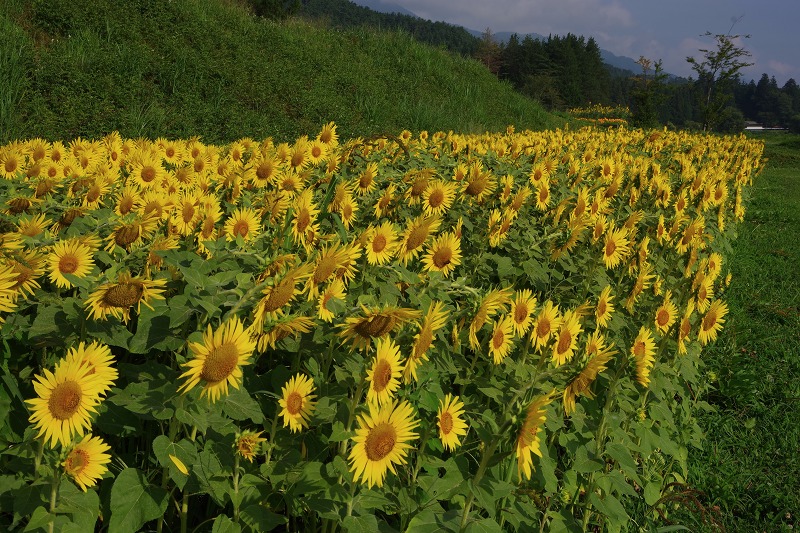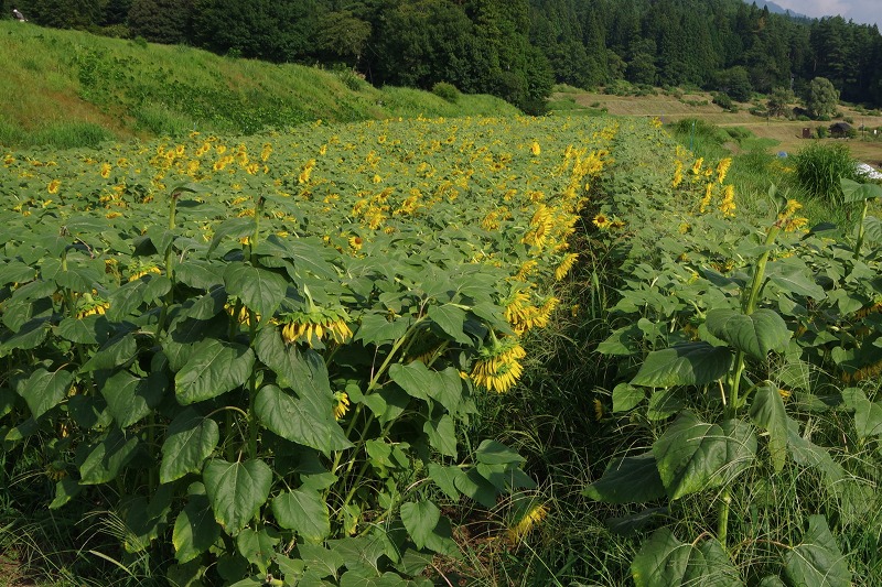 今朝は西の空に青空が広がりました。里山文化ゾーンのヒマワリは青空を背景に絶好調・・・と言いたいのですが、一部花が下向きになってきました。
