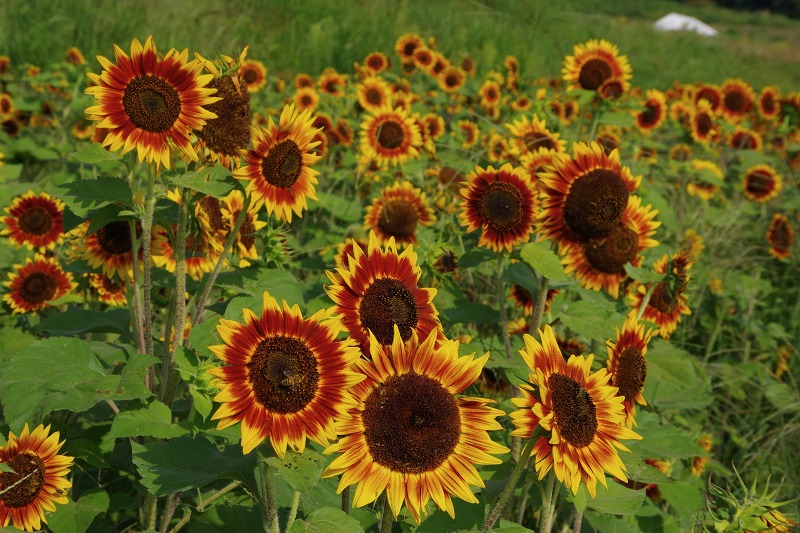 里山文化ゾーン・棚田エリアのヒマワリは、八重咲品種の〝札幌八重まるこ〟が見頃になりました。ボリュームのある花が咲き揃って見応え十分です。