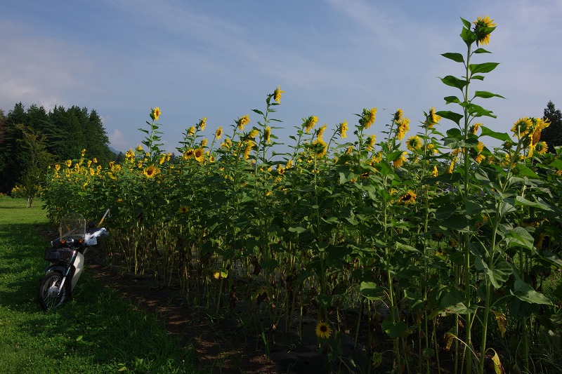 こちらは一際背の高い〝チャンチュントール〟。バイクと比べてもその大きさがわかります。一番伸びている株は、3m程にまで成長していました。多くのヒマワリが下向きになりましたが、見頃のヒマワリも見てくださいね。