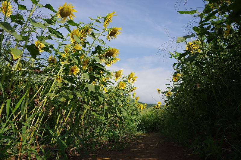 ヒマワリ迷路も下を向いています。ちびっ子目線で撮影すると、なんだか秘密基地のようですよ。目線の低い子供たちには楽しそうですね。