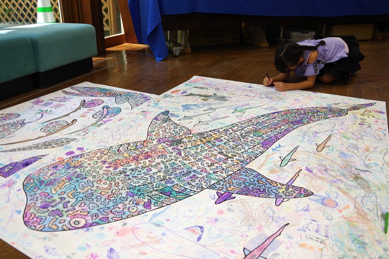 子供たちが描いたカラフルな海の生き物のイラスト。ちーたんも隅っこに可愛いクラゲの絵を描き入れました。実際の海で泳いでいたら楽しそうですね。