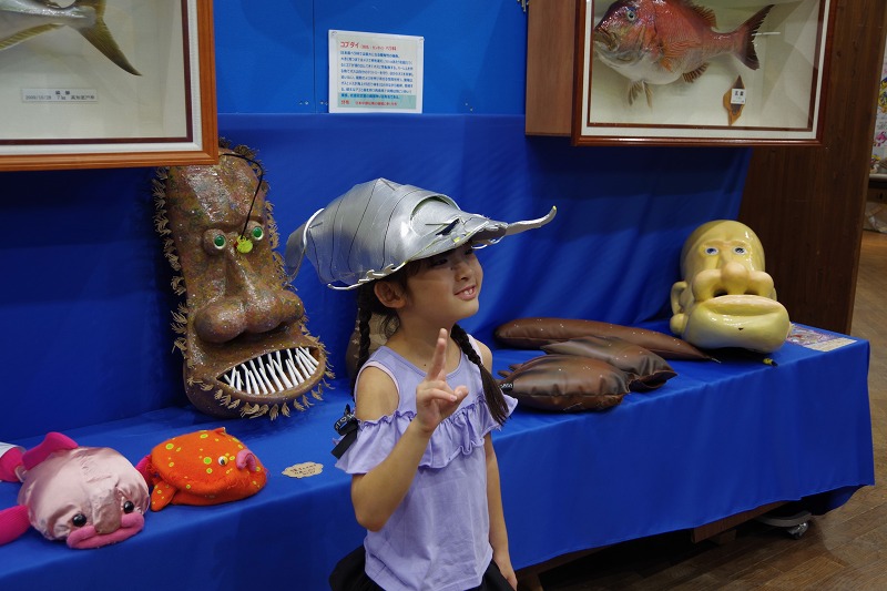 おやゆび姫ちゃんたちと入れ違いで来てくれたのは〝ちーたん〟です。『魚魚展』は初見学。ズラリと並ぶ魚の剥製よりも、被り物が気に入ったようです。