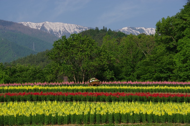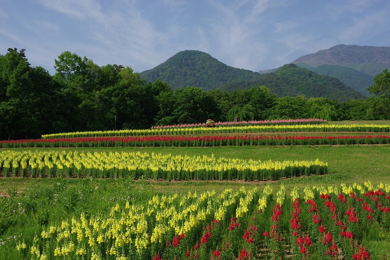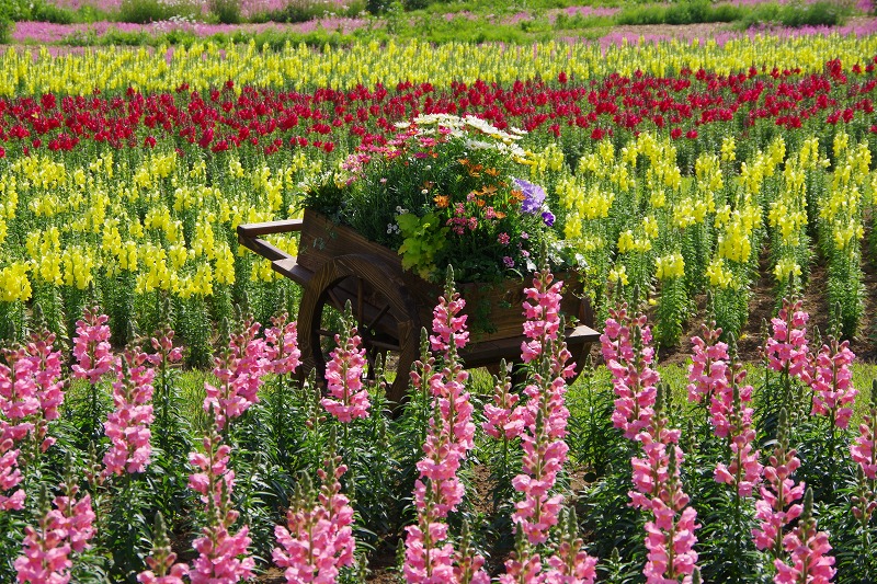 キンギョソウの花畑だけを撮影すると、こんな感じです。黄色や赤、ピンクの花が目に鮮やかです。隠れていますが白も少しだけありますよ。