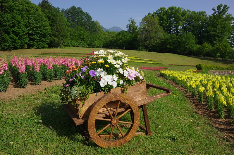 ここ数日、曇りや雨の日が続いていましたが、今日は朝から晴れ間が広がりました。穂高口前の見晴らしの丘では、サクラナデシコとキンギョソウが見頃です。