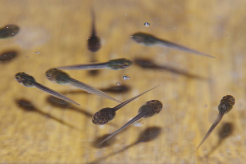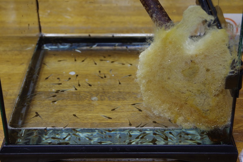 次の特別展示は、5月31日から始まる『あめあめふれふれカエル展』です。カエル展が始まる前に、神奈川県からやって来たモリアオガエルが産卵し、卵塊からオタマジャクシが出てきました。