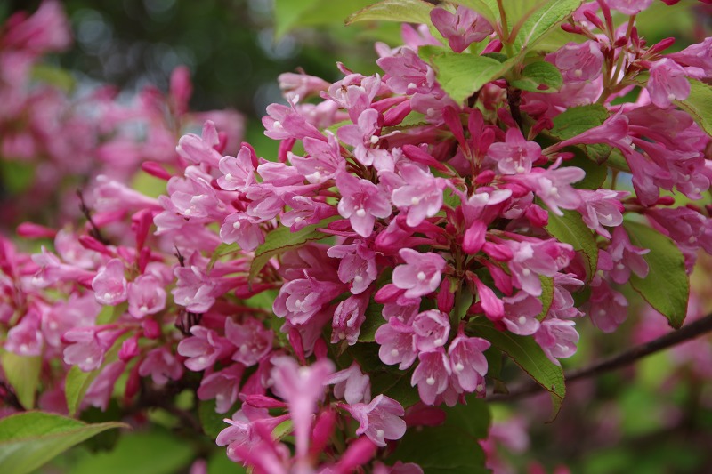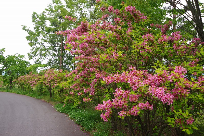 水辺の休憩所近くの園路沿いではタニウツギが見頃です。山地の谷沿いに生育するのが名前の由来ですが、何故か日当たりの良い場所に植えられているのです。