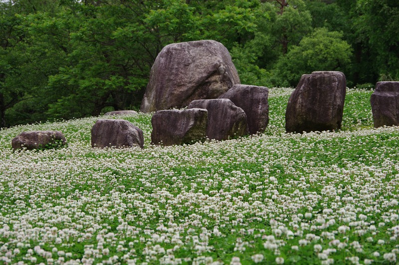 シロツメクサが成長して、たくさんの花を咲かせていました。まるで遺跡のようですね。定期的に草刈りをするので、かえって貴重かもしれませんよ。