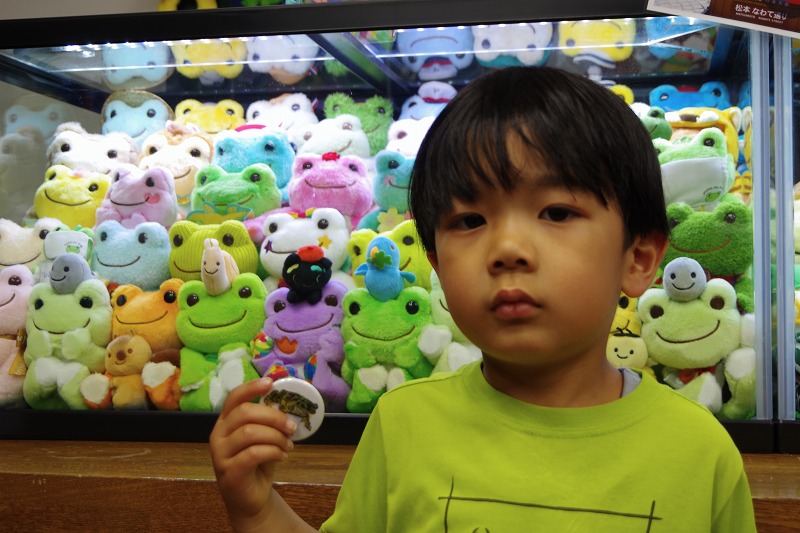 お馴染みの〝そうちゃん〟と〝ちーくん〟兄弟が、カエル展を見に来てくれました。そうちゃんは今年新しくなったカエルの缶バッジのガチャに挑戦。ベトナムコケガエルをゲットして、実物と一緒に記念撮影をしましたよ。